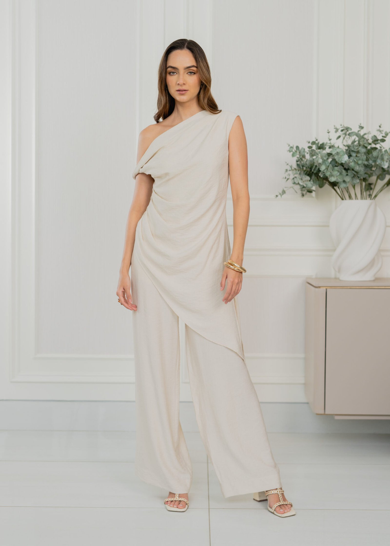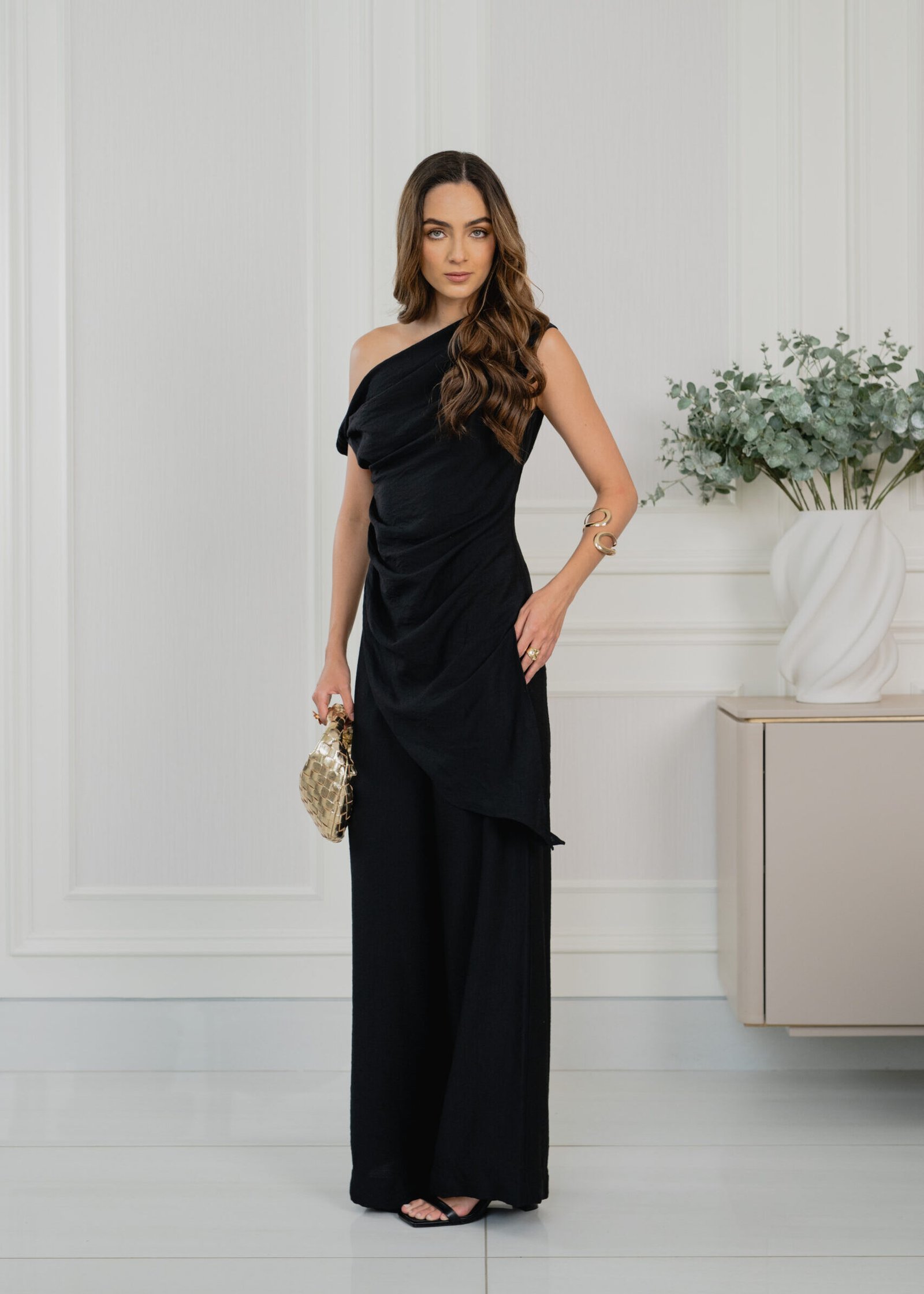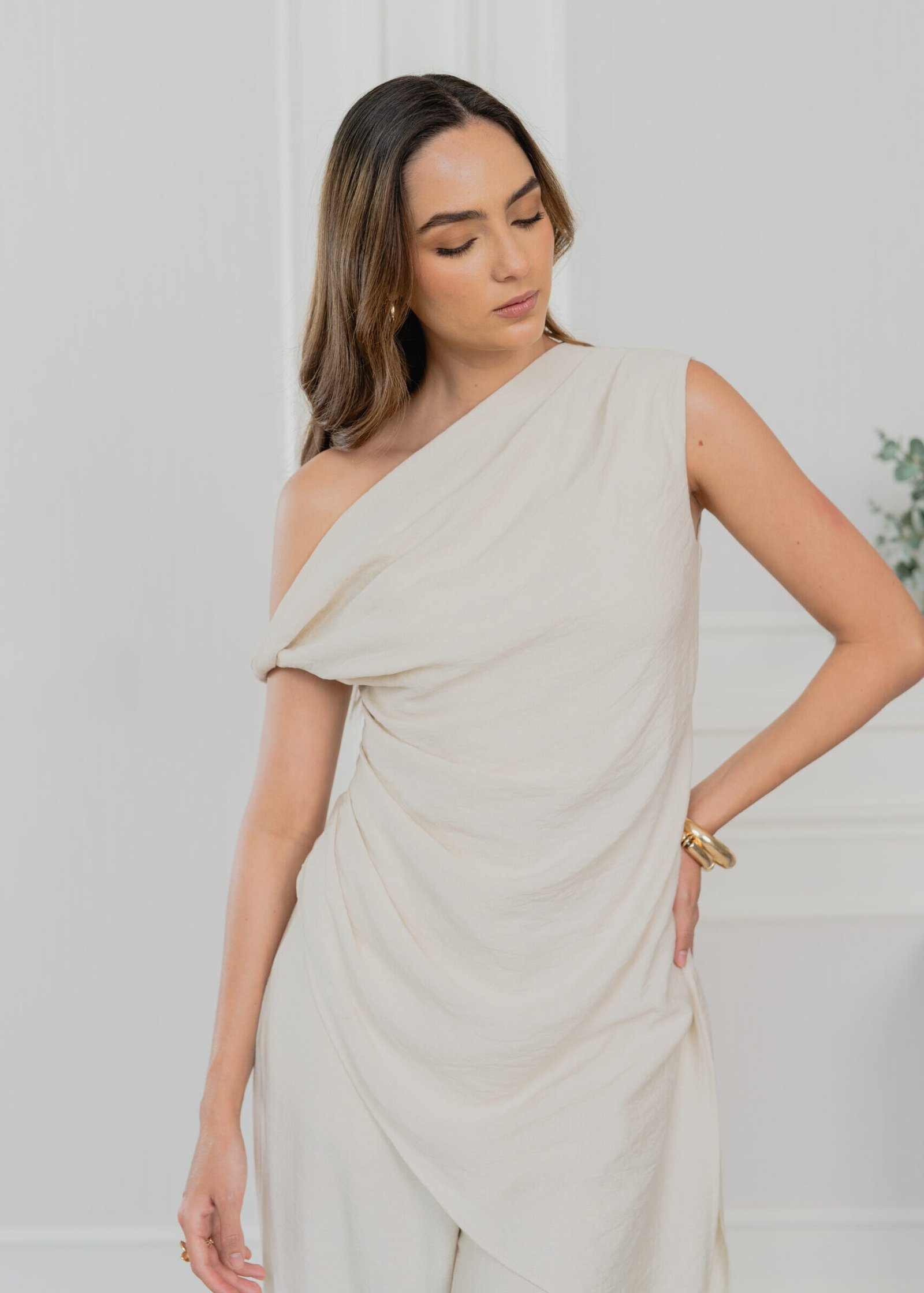 Blusa de un solo hombro con delicados pliegues que crean un efecto drapeado sobre la silueta, su diseño asimétrico aporta movimiento.