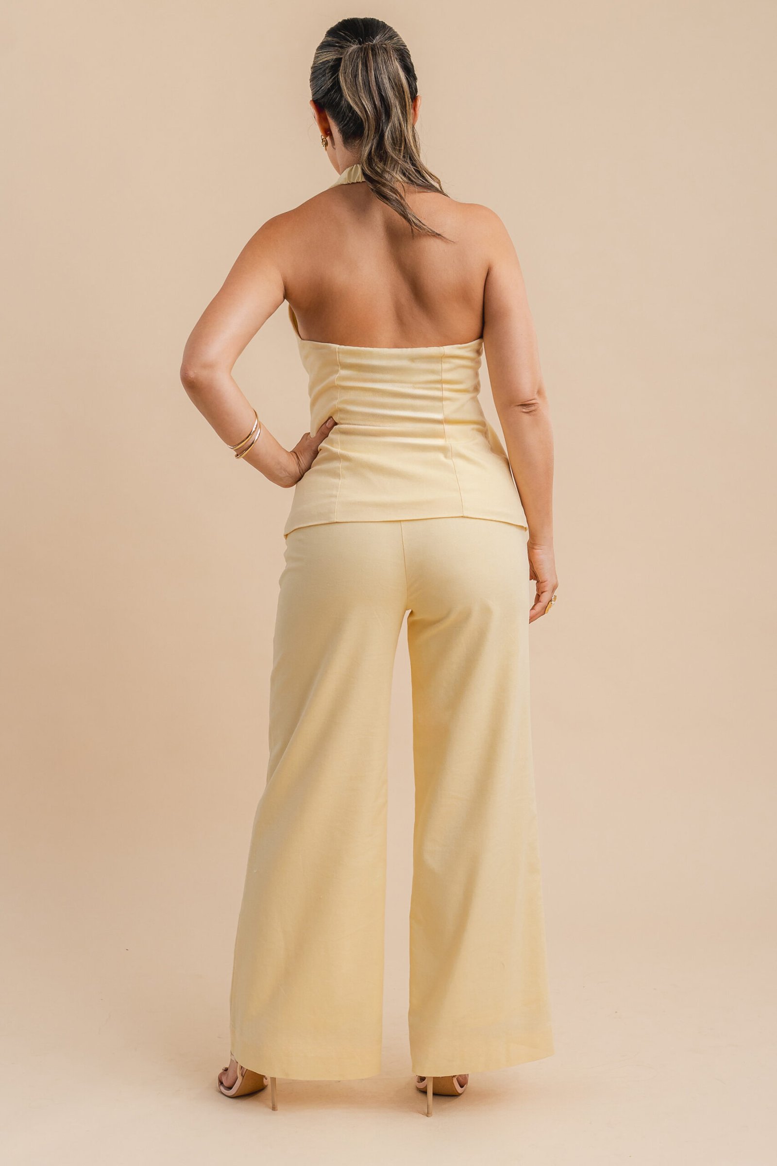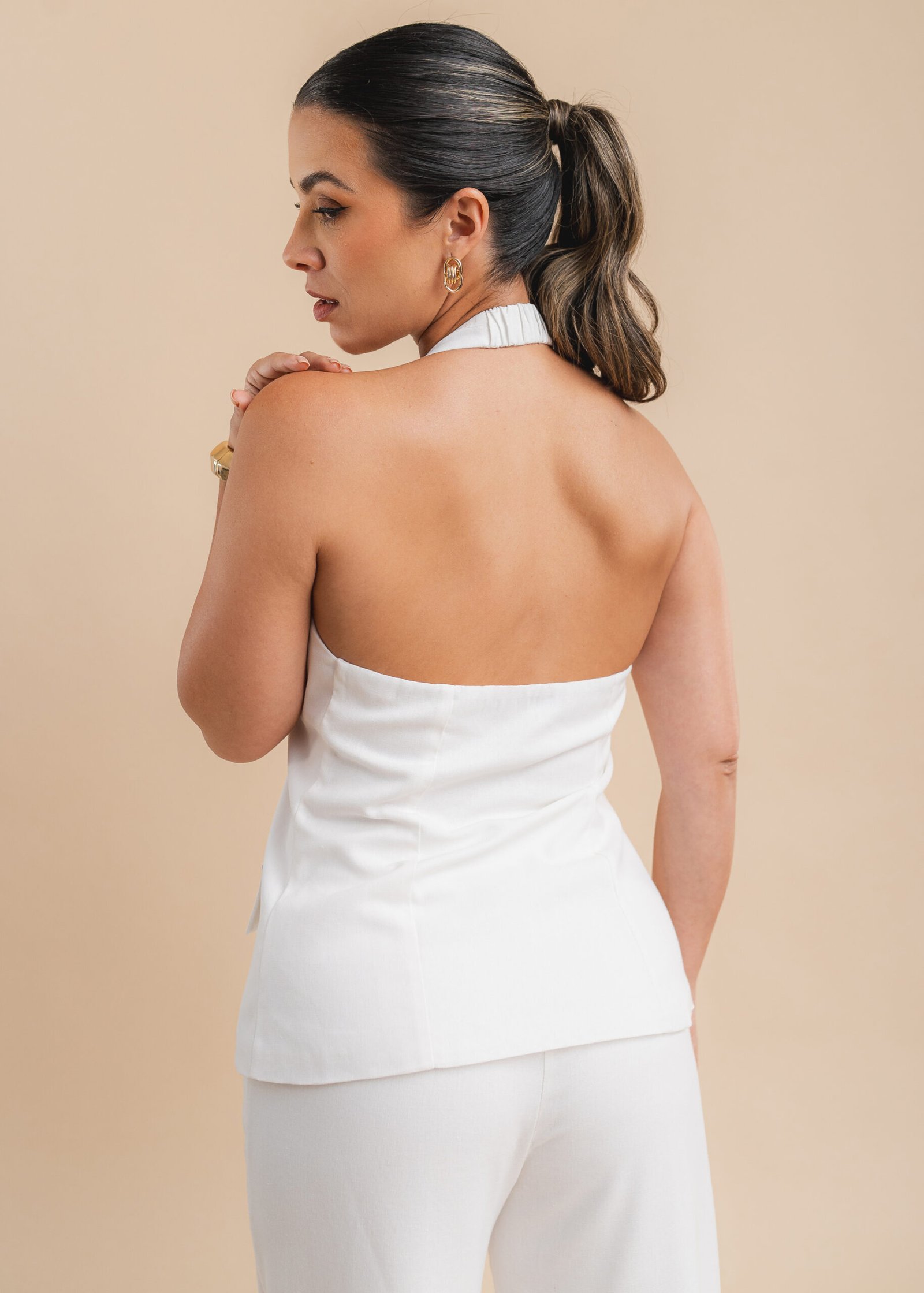 Chaleco largo con botón decorativo, confeccionado en lino mixto de textura natural.