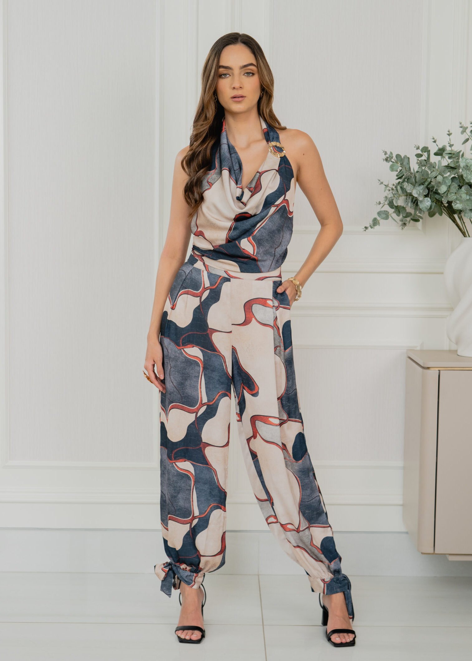 Pantalón harem de silueta fluida, con print exclusivo de la temporada y tiras ajustables en los tobillos que realzan su movimiento.
