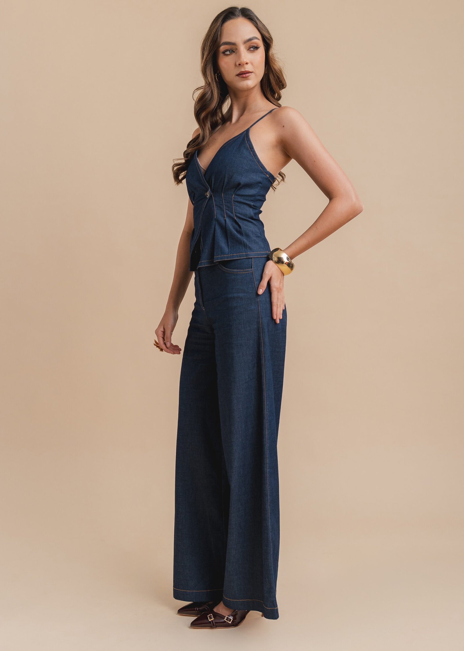 Pantalón palazzo de índigo liviano stretch con pretina definida y confección técnica.