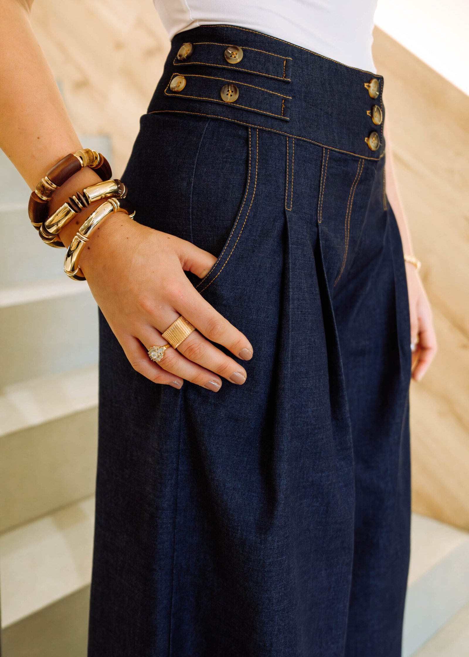 Pantalón denim liviano de silueta palazzo, con caída fluida y detalles de botones en la cintura que elevan el diseño.