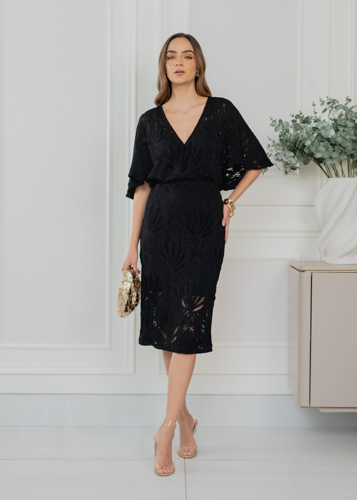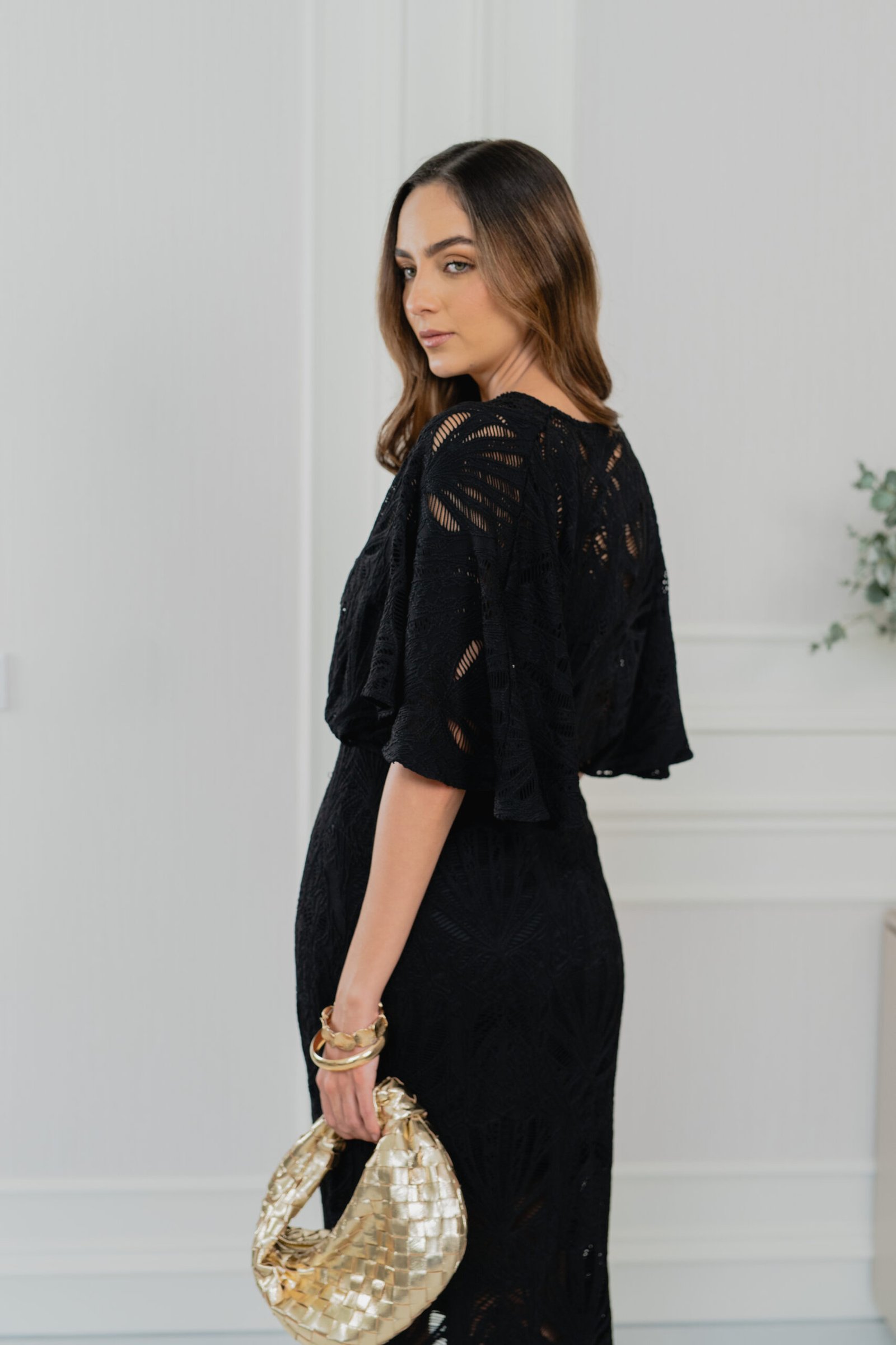 Vestido midi con diseño de crochet exclusivo de Maremia y vestido interno elástico que equilibra estructura y delicadeza.